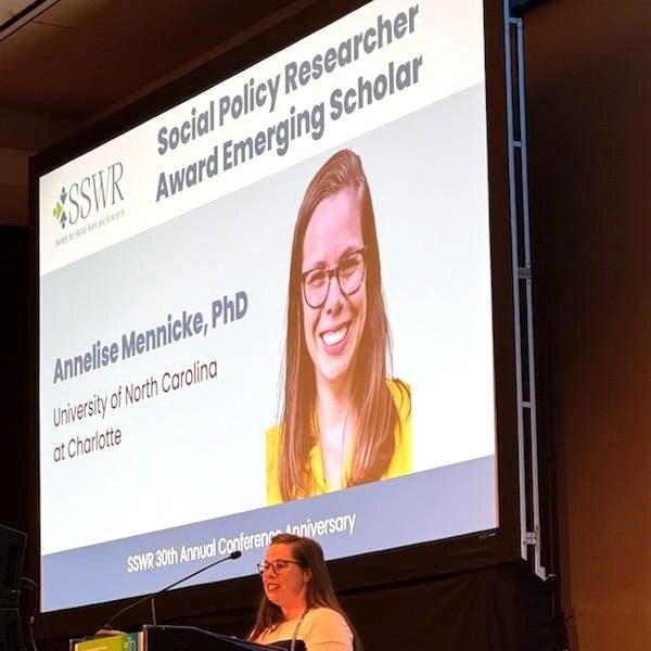 Dr. Annelise Mennicke, Associate Director of Research at the UNC Charlotte Violence Prevention Center, has been recognized with the Social Policy Researcher Award at the Society for Social Work and Research (SSWR) Conference.