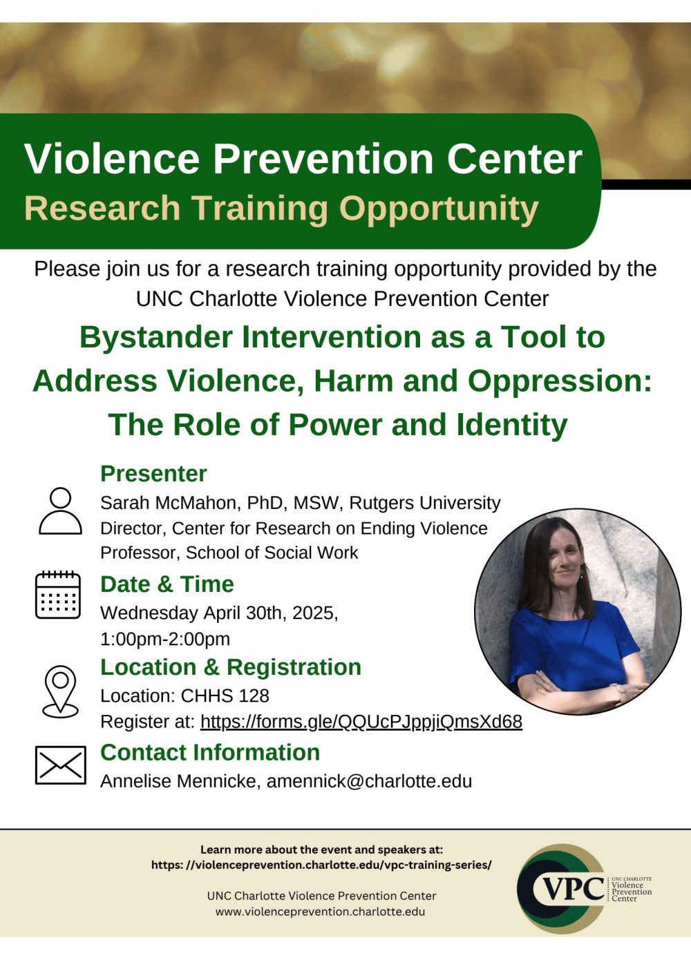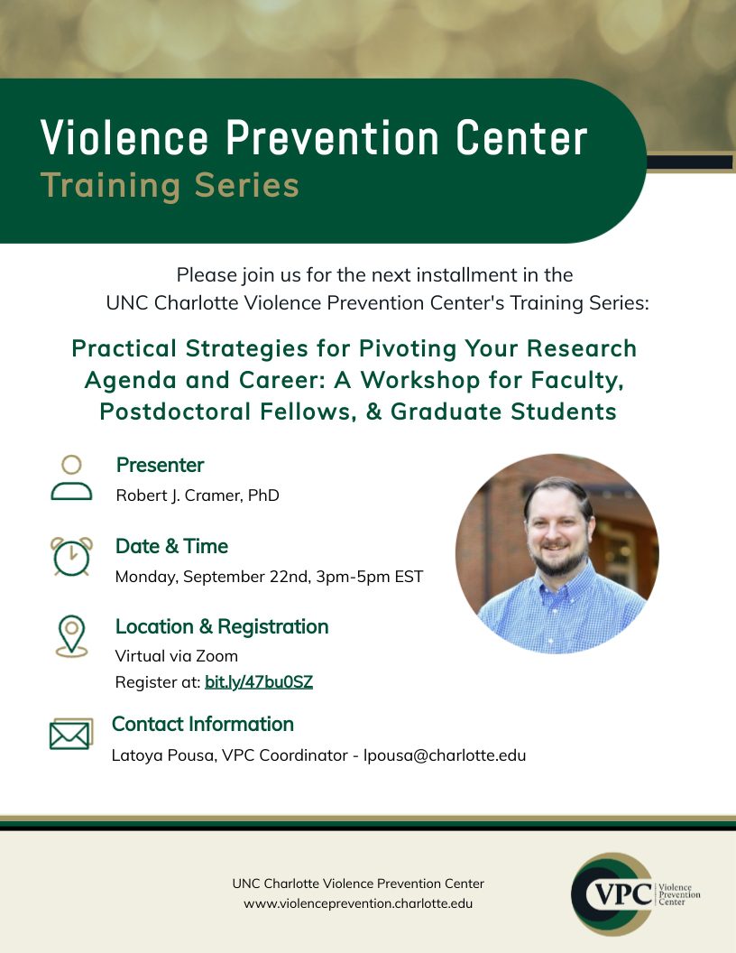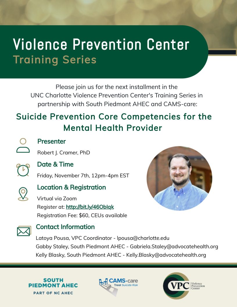 This training is offered through a regional partnership between the UNC Charlotte Violence Prevention Center and the South Piedmont Area Health Education Center.