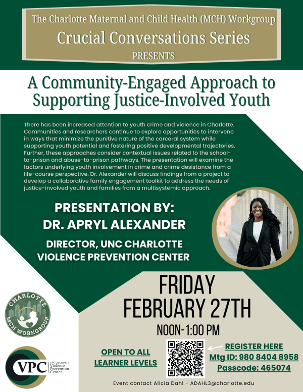 The UNC Charlotte Violence Prevention Center is proud to collaborate with the Charlotte MCH Workgroup to present the following Crucial Conversation.