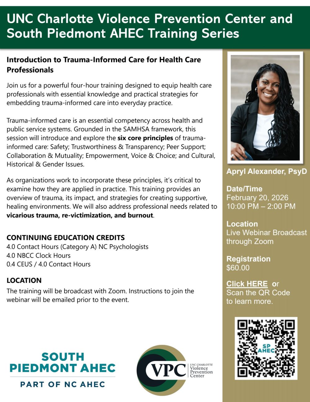 The Spring 2026 Training Series is offered through a regional partnership between the UNC Charlotte Violence Prevention Center and the South Piedmont Area Health Education Center. Each training will be held virtually, and a link will be shared upon registration. Trainings will not be recorded unless otherwise noted in the event description. All sessions offer continuing education credits.