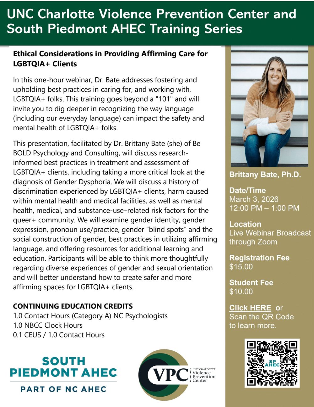 This presentation, facilitated by Dr. Brittany Bate (she) of Be BOLD Psychology and Consulting, will discuss research-informed best practices in treatment and assessment of LGBTQIA+ clients, including taking a more critical look at the diagnosis of Gender Dysphoria. We will discuss a history of discrimination experienced by LGBTQIA+ clients, harm caused within mental health and medical facilities, as well as mental health, medical, and substance-use–related risk factors for the queer+ community. We will examine gender identity, gender expression, pronoun use/practice, gender “blind spots” and the social construction of gender, best practices in utilizing affirming language, and offering resources for additional learning and education. Participants will be able to think more thoughtfully regarding diverse experiences of gender and sexual orientation and will better understand how to create safer and more affirming spaces for LGBTQIA+ clients.